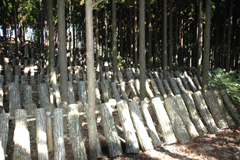 丁寧に手入れされたスギ林の中に、クヌギやコナラなどのほだ木(原木にキノコの菌を植えつけたもの)を並べて栽培しています。