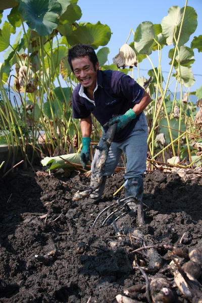 れんこんの収穫は、できるだけ傷がつかない様に、ほとんどを手作業で行います。